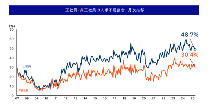 福岡県の企業のうち約半数である48.7%が正社員不足である。(2025年4月時点)
