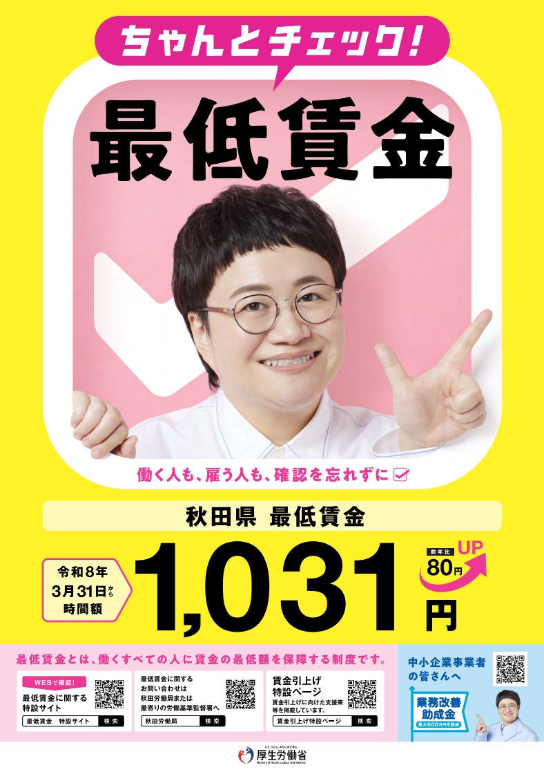 秋田県は最低賃金を80円引き上げ、1,031円とする。