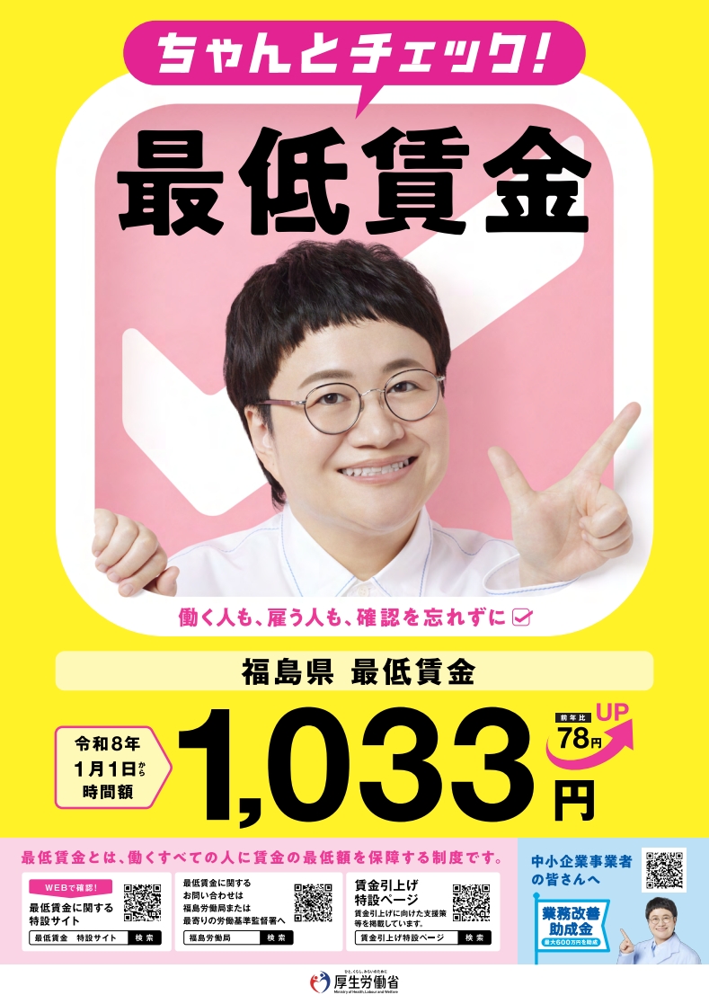 福島県は令和8年1月1日より最低賃金を時給1,033円に改正する。