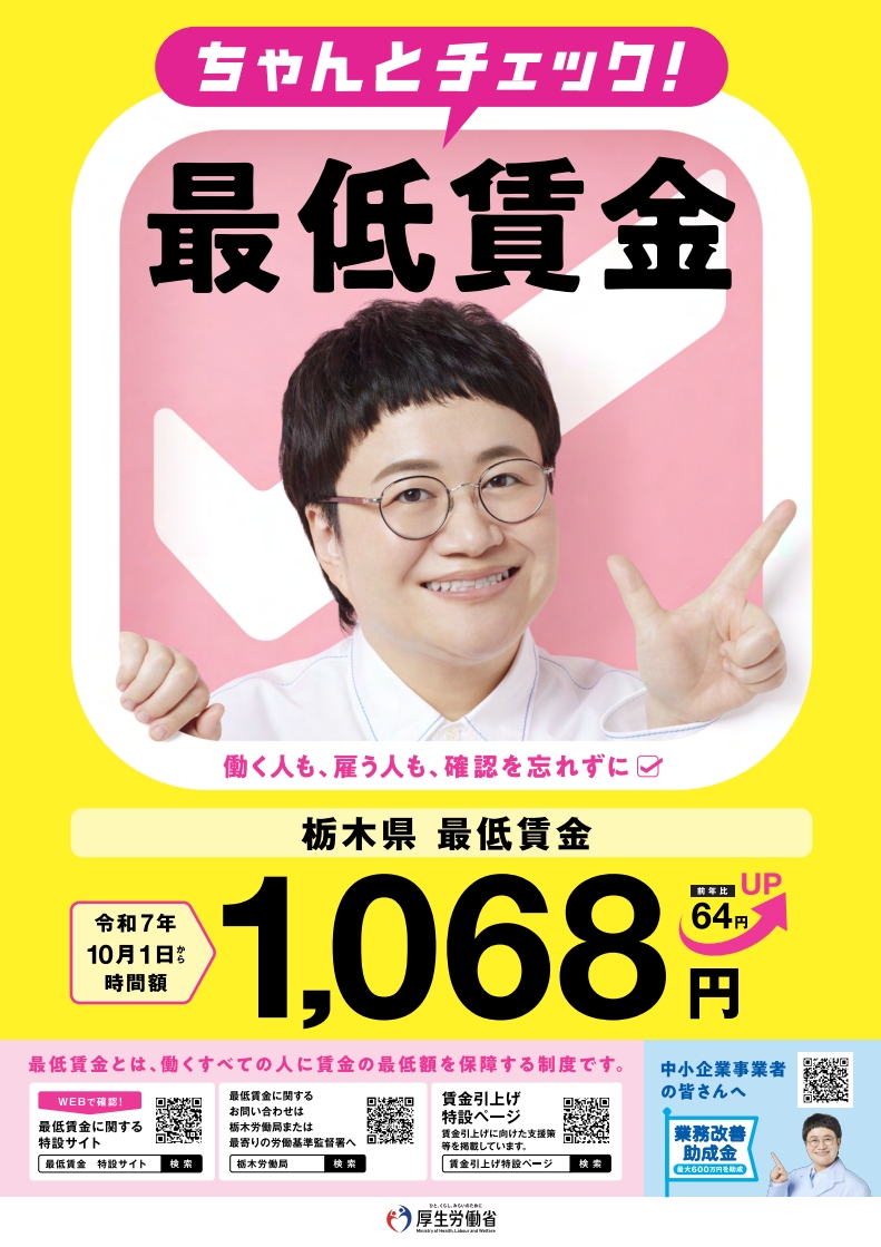 栃木県は令和7年10月1日より最低賃金を時給1,068円に改定した。