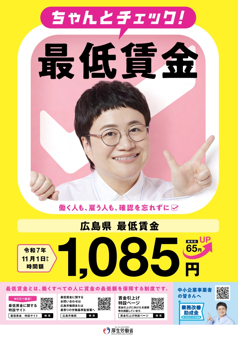 広島県は最低賃金を令和7年11月1日より時間額1,116円に改正する。